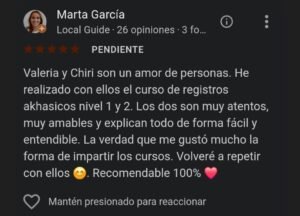 Consta de dos sesiones online. Aquí incorporarás la técnica para abrir los Registros Akáshicos de otras personas, así como de animales y plantas. Además, fortalecerás tu canal para recibir mensajes claros y acompañar procesos desde un lugar amoroso y consciente.